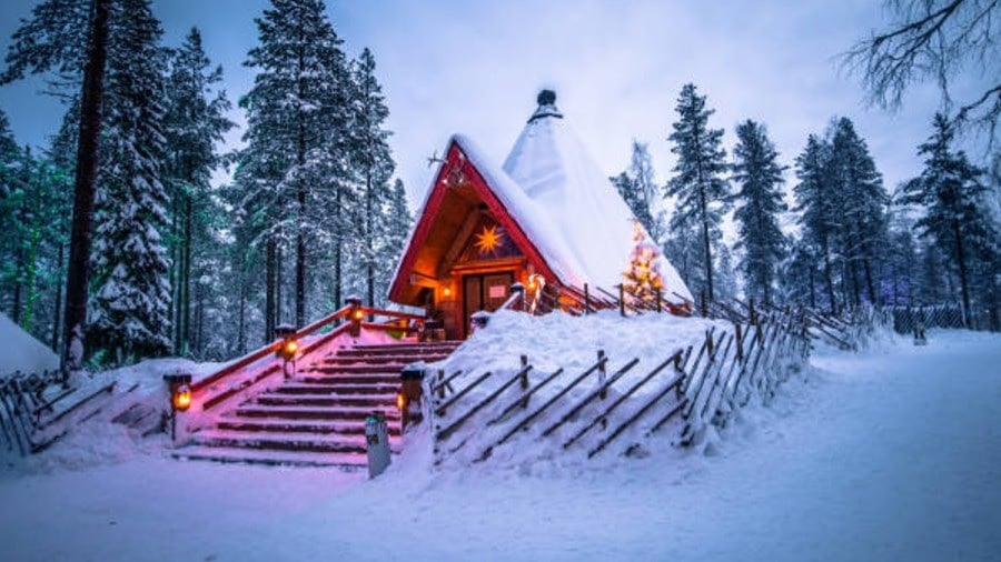 Na fotografiji je prikazana kuća do koje se morate popeti velikim stubištem. Oko kuće je crnogorična šuma, grane drveća se savijaju od velike količine snijega. U blizini kuće su lampioni, a cijelo dvorište je prekriveno debelim slojem snijega koji gotovo u cijelosti prekrije ogradu.