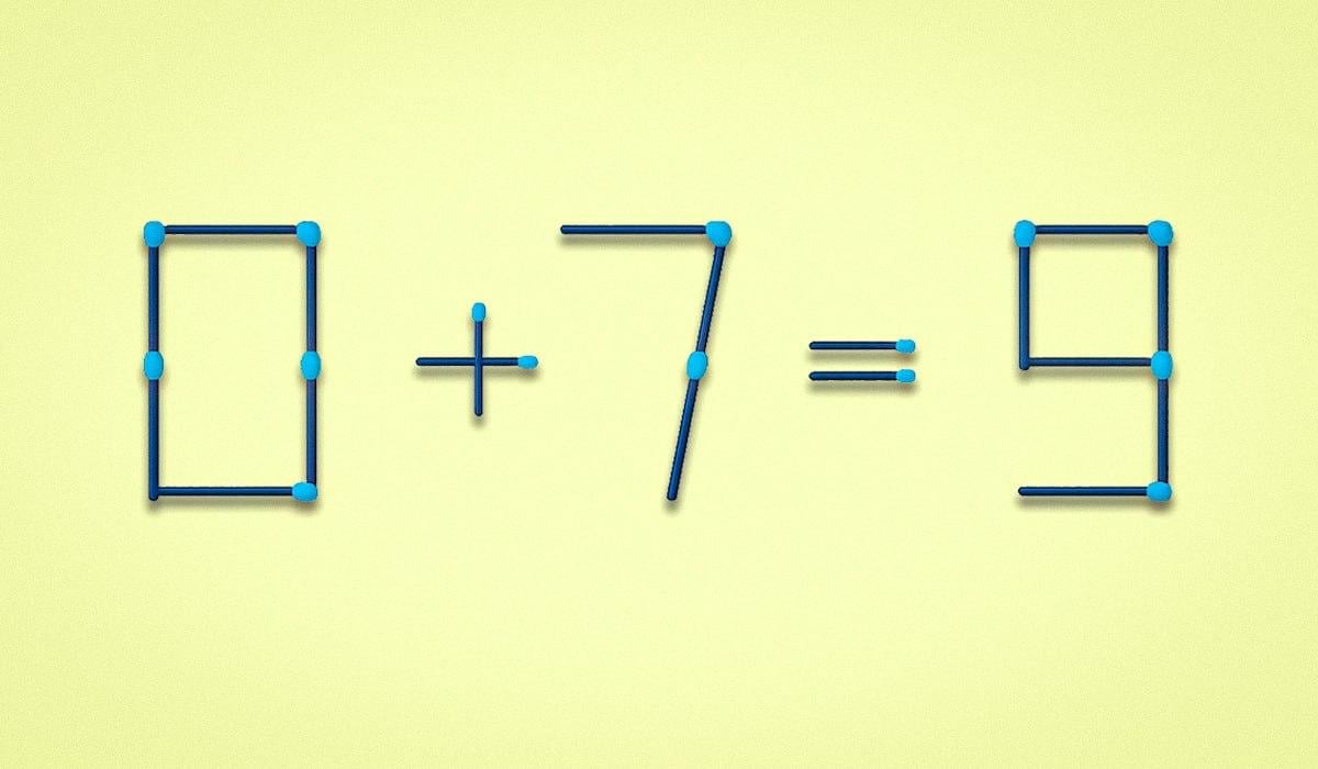 Ispod ćete vidjeti sliku na kojoj je jednakost 0+7=9 postavljena pomoću šibica. U njemu postoji greška koju morate popraviti.